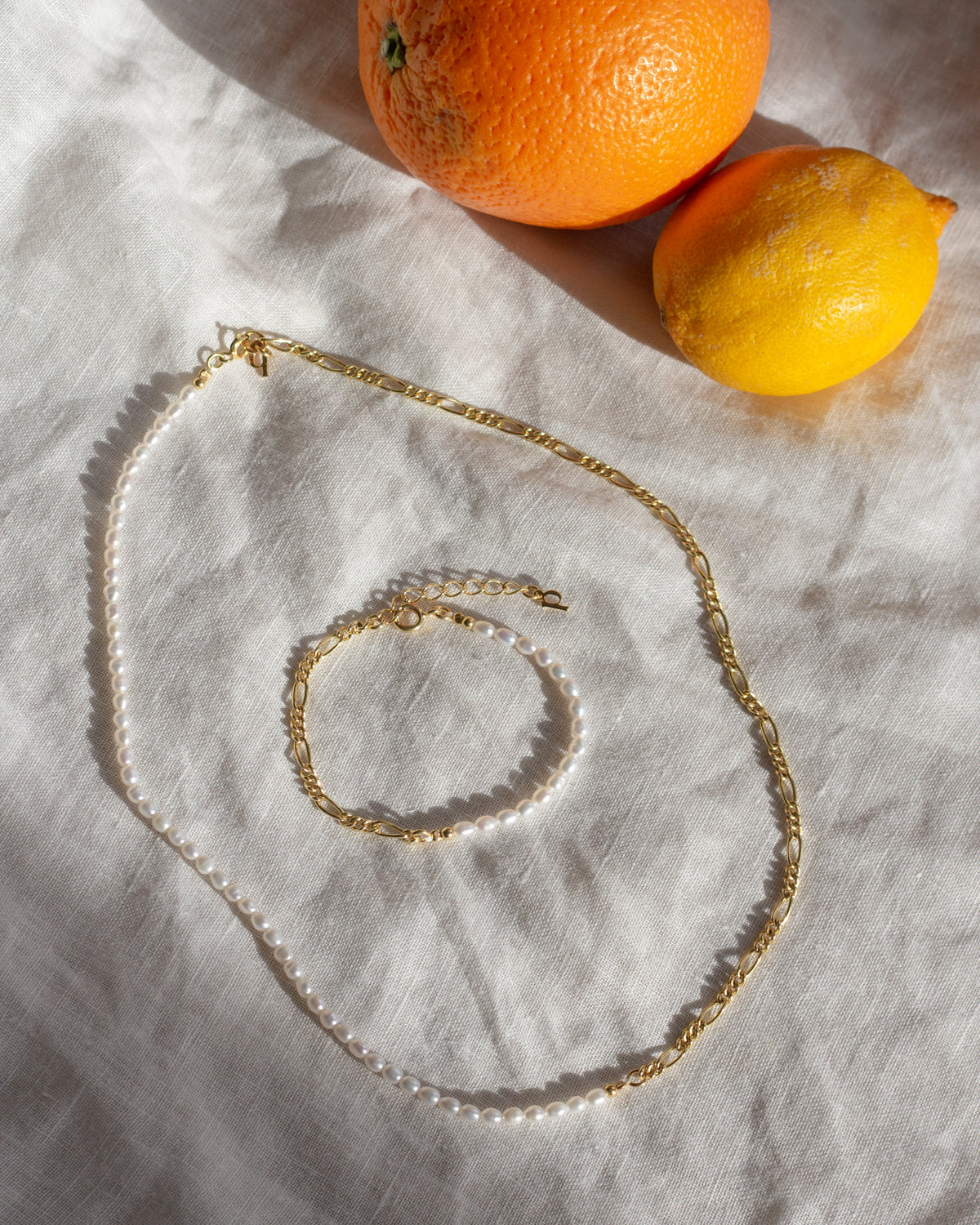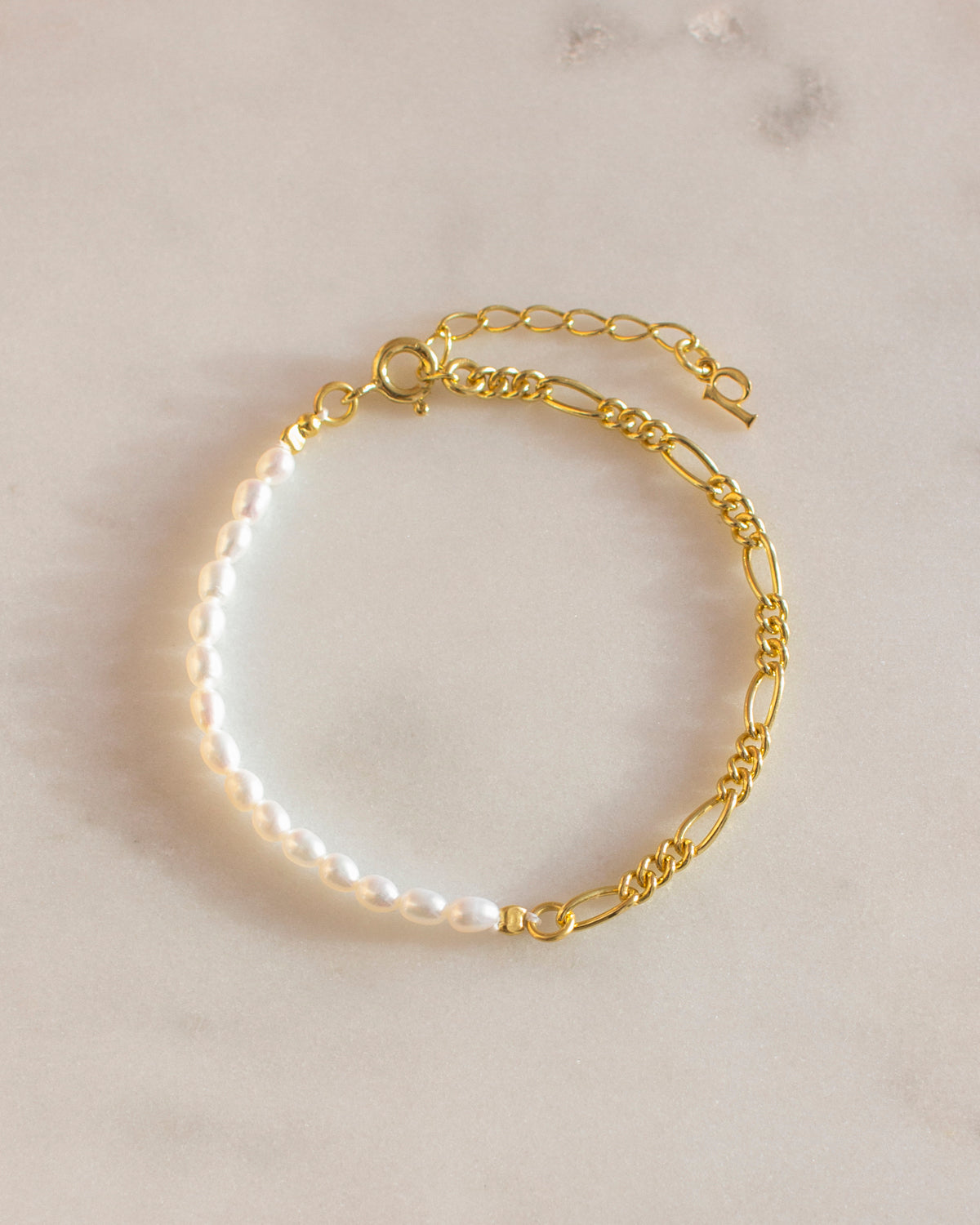 Halb Perlenkette und halb Gliederkette – das Best of Both Worlds Armband kombiniert das Beste aus beiden Welten. Gefertigt aus echten Süßwasserperlen mit einem wunderschönen Regenbogenschimmer und einer klassischen Figaro-Kette.